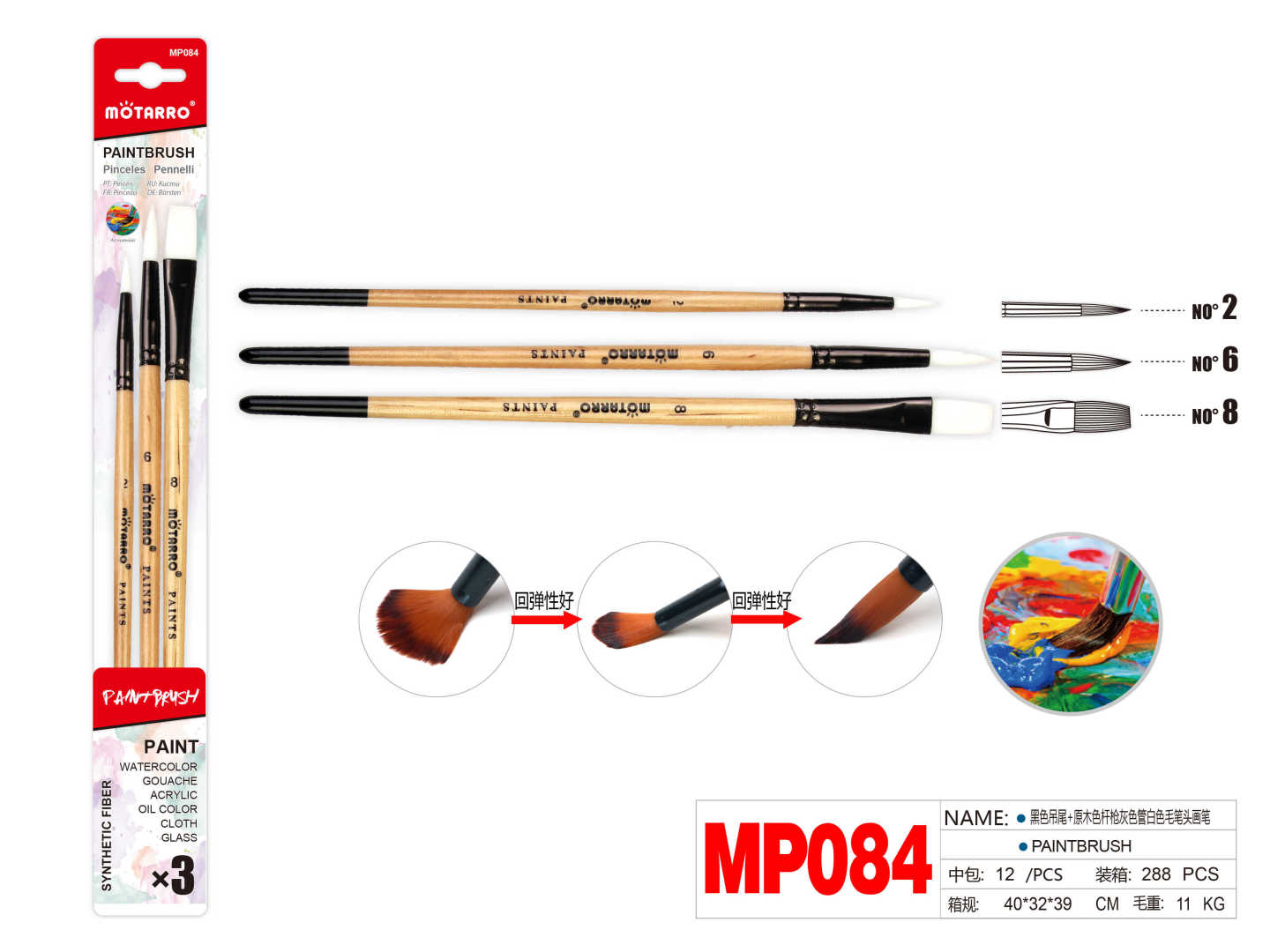 Set of 3 Paint Brush Nature Color Round No.2/6 &Long Flat No.8