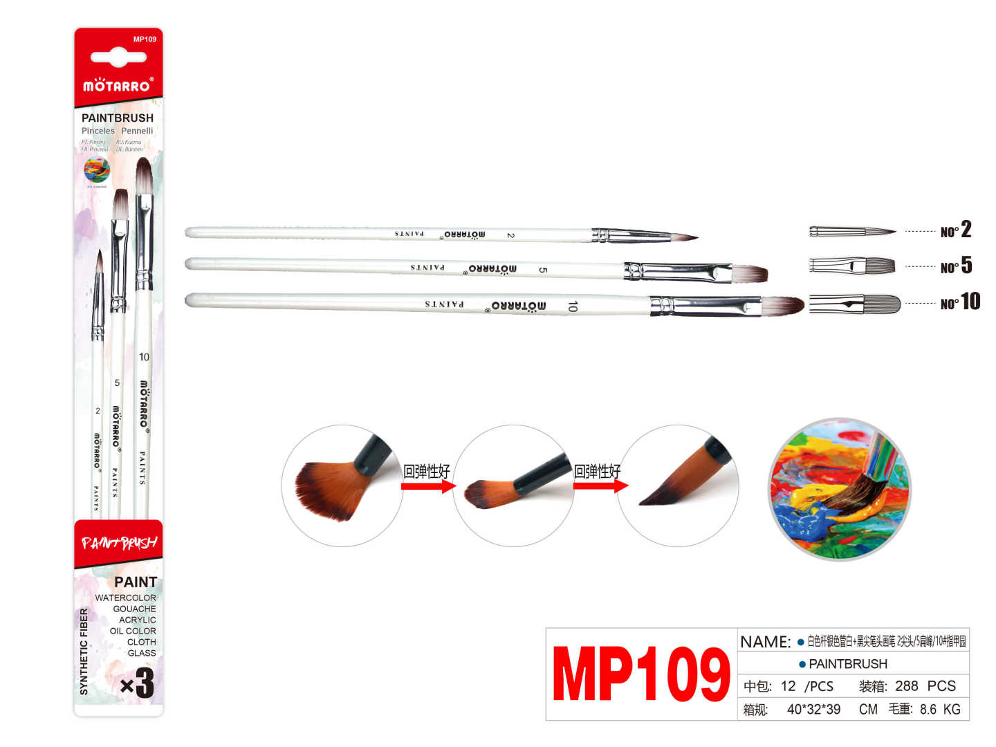 Set of 3 Paint Brush White RoundNo.2, Long Flat No.5 & Filbert No.10
