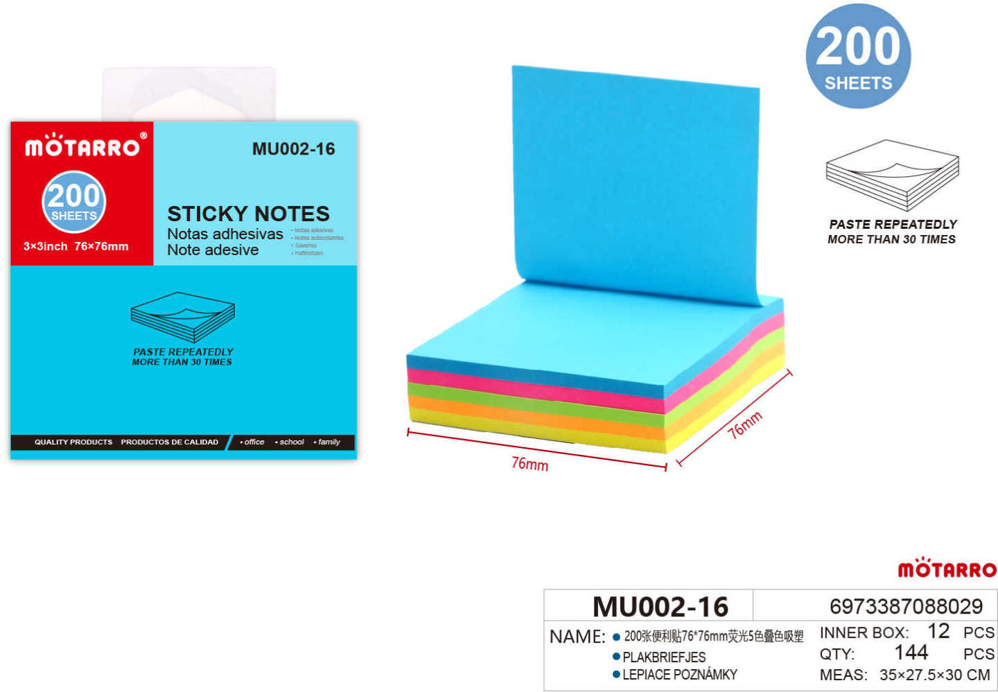 Sticky Notes 76*76mm 200pcs 5 Fluoro Color Mixed
